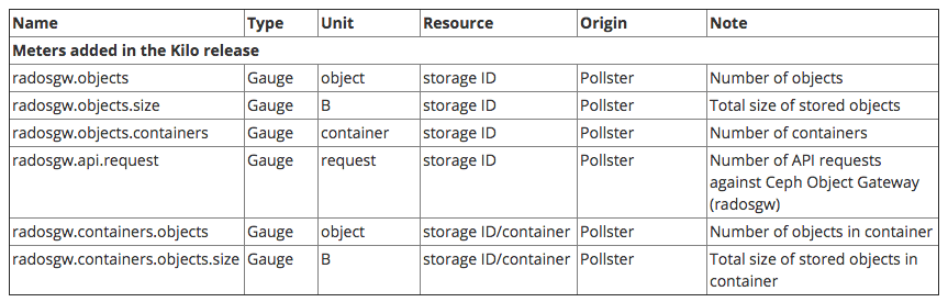 下面是 Ceph object storage 會收集的 meters: